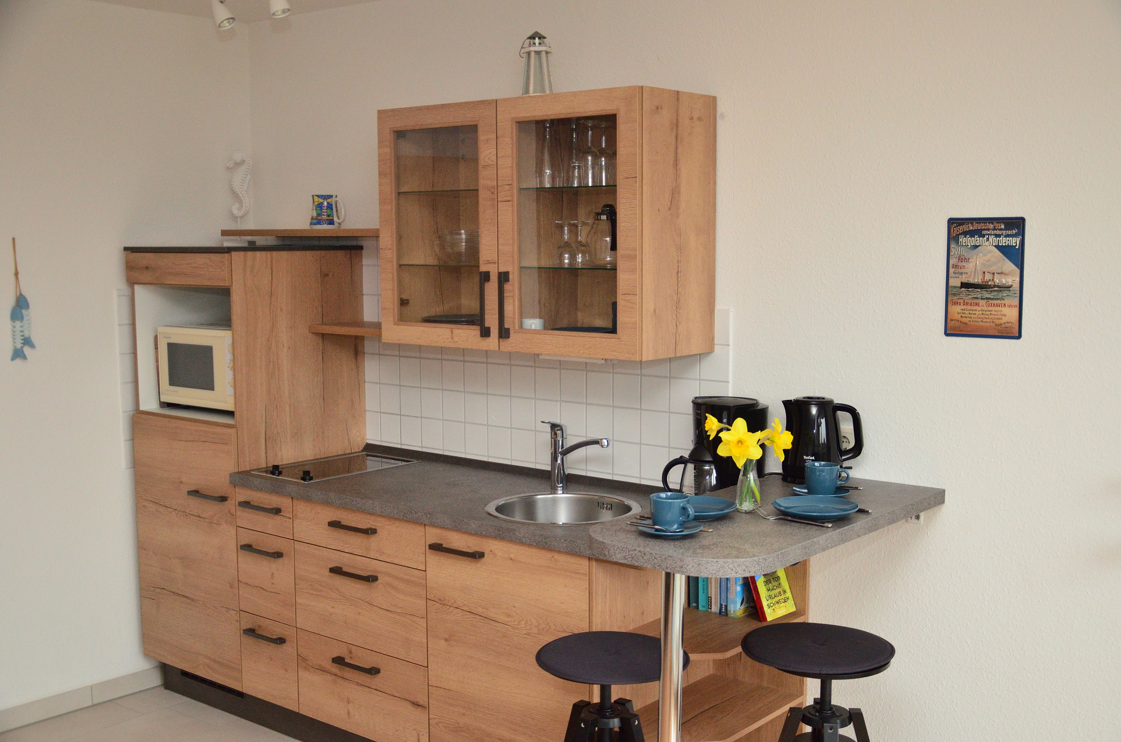 Modernes 1-Raum-Appartement nahe Strand und Natur – Oasis 05 in Cuxhaven-Döse Das gemütlich und modern eingerichtete 1-Raum-Nichtraucherappartement „Oasis 05“ liegt in der 1. Etage des Hauses Oasis im Eingang 115, direkt an der Grenze zwischen Cuxhaven-Döse und Duhnen. Der Strand sowie das Meerwasserfreibad Steinmarne sind in wenigen Gehminuten erreichbar – ideal für erholsame Tage an der Nordsee. Die geschmackvoll sanierte Wohnung bietet einen offenen Wohnschlafraum mit moderner Sitzgarnitur, TV, kostenlosem WLAN und einem gemütlichen Doppelbett in einer Schlafnische. Die neue, integrierte Küchenzeile ist mit Kühlschrank, Cerankochfeld und Mikrowelle ausgestattet und bietet alles für die kleine Selbstverpflegung zwischendurch. Ein besonderes Highlight ist der Südbalkon mit Blick ins Grüne, der vom Wohnbereich aus zugänglich ist und zum Verweilen einlädt. Das vollständig sanierte Duschbad ist hochwertig ausgestattet und rundet den Wohnkomfort ab. Im Haus steht Ihnen zusätzlich eine Sauna (gegen Gebühr) zur Verfügung. Für Ihr Auto ist ein Tiefgaragenstellplatz reserviert (Einfahrtshöhe 1,90 m). Haustiere sind nicht erlaubt und das Rauchen ist ausschließlich außerhalb der Wohnung gestattet.