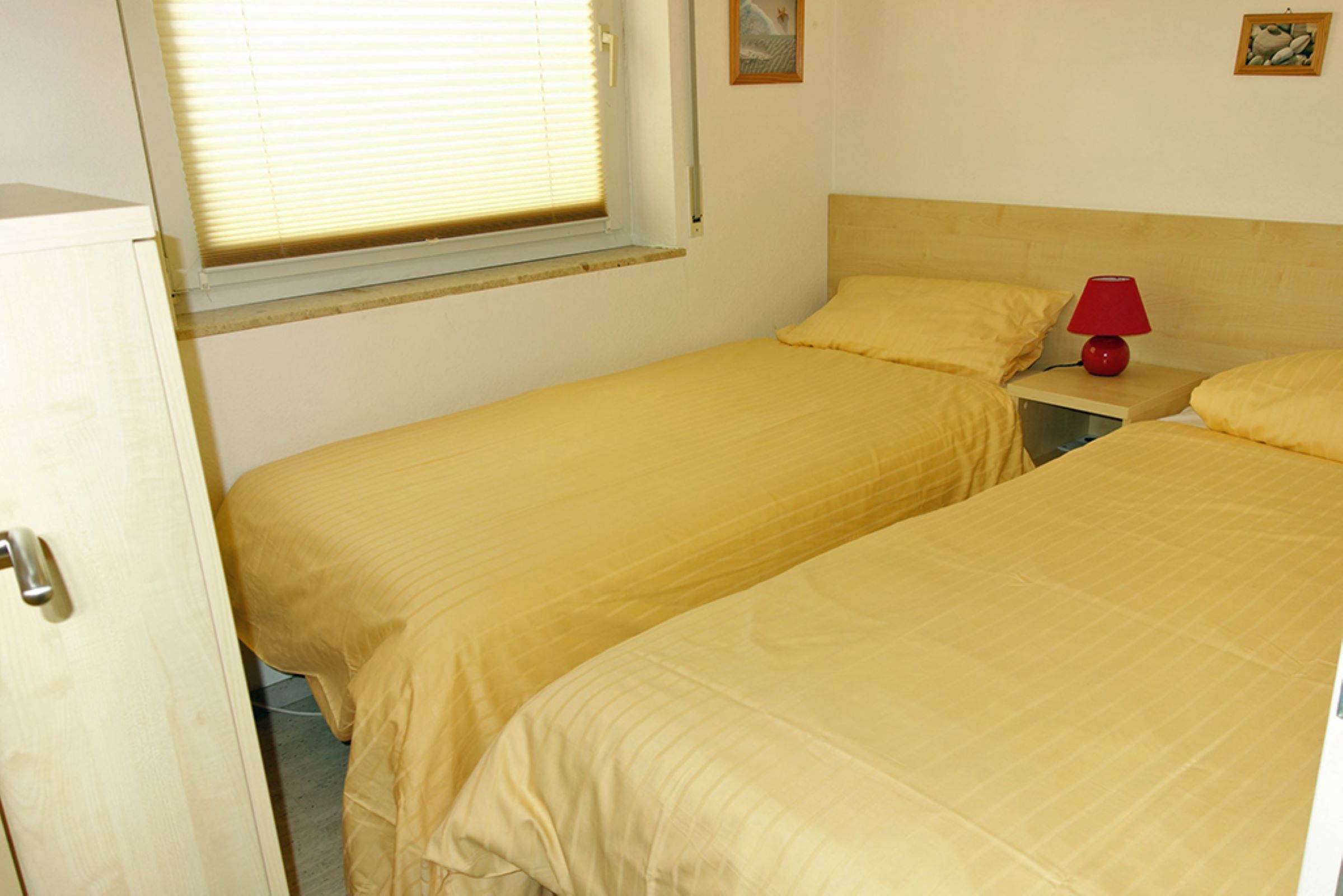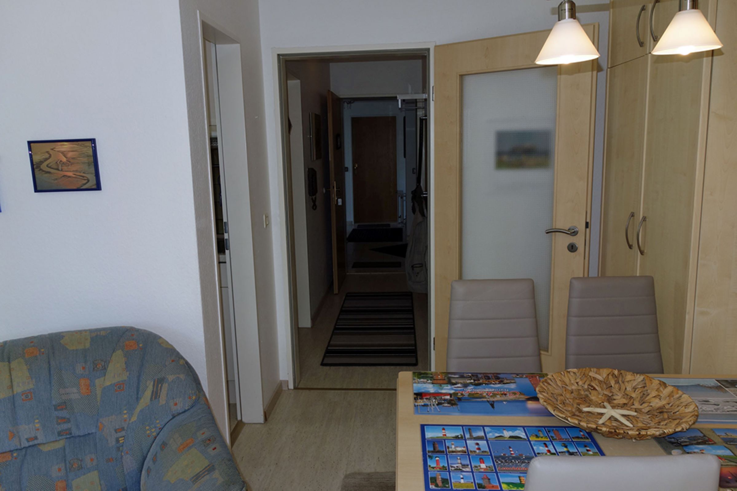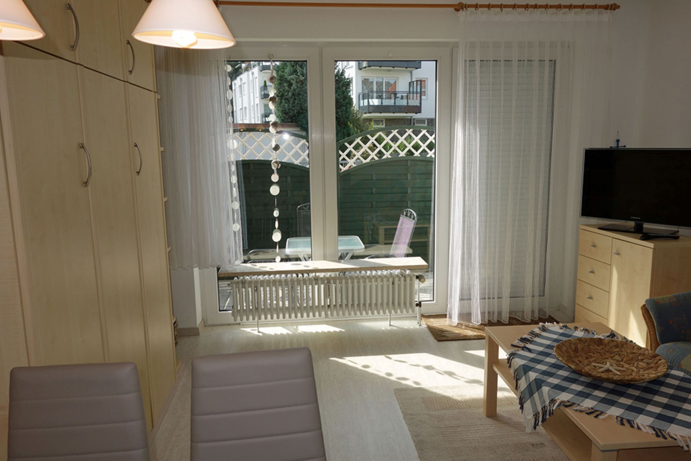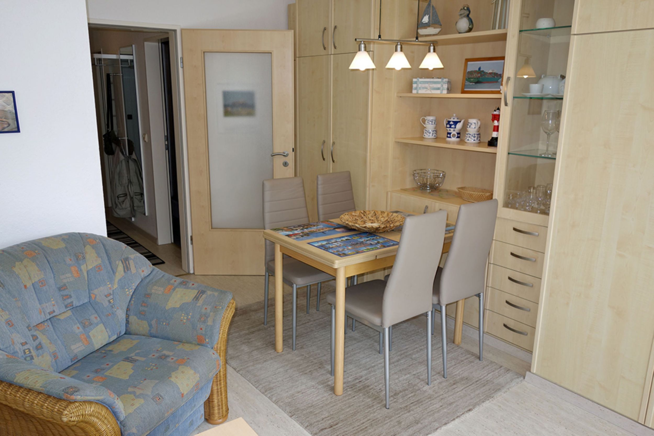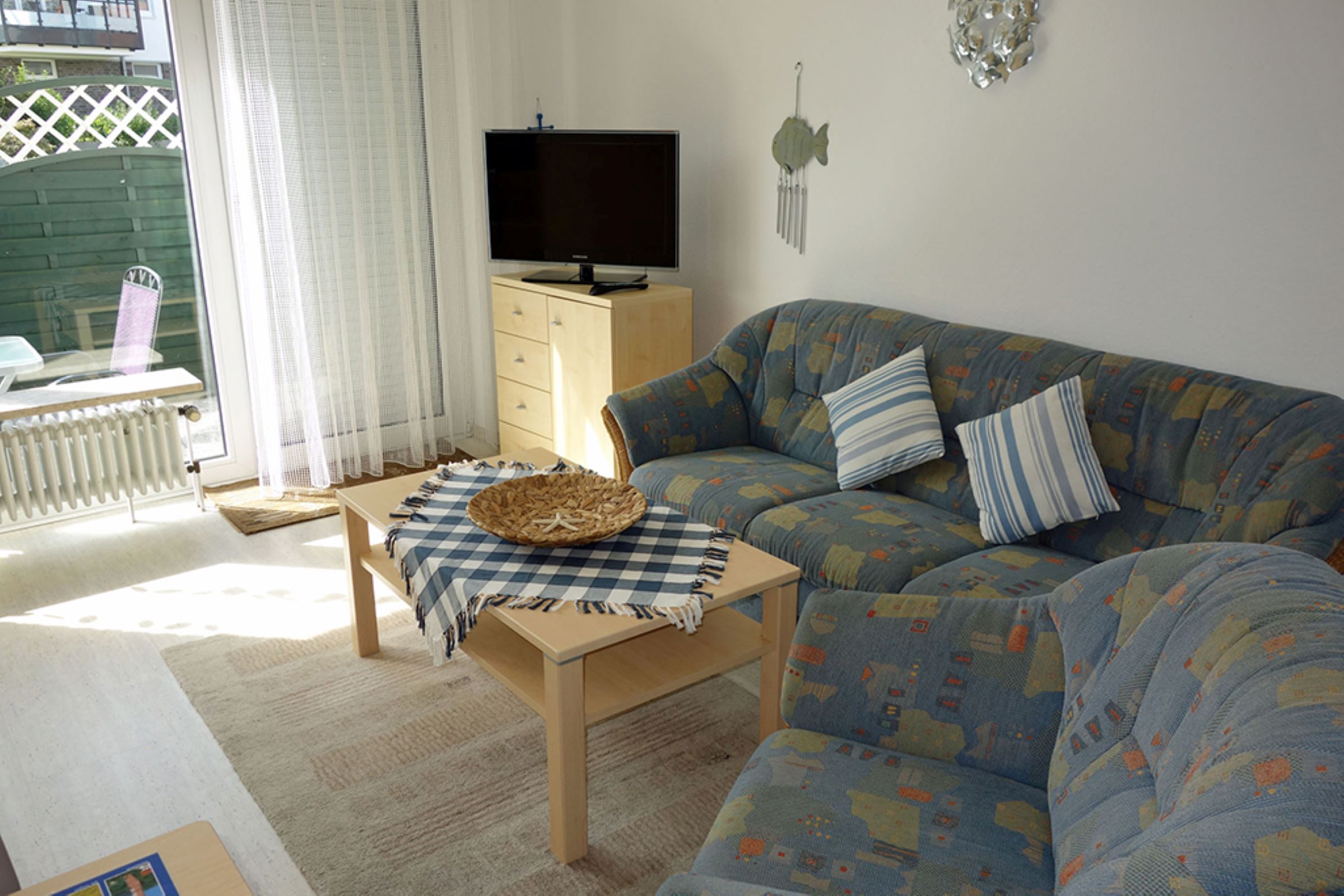 Diese gepflegte Ferienwohnung befindet sich in der verkehrsberuhte Straße Voßhörn, einer sehr guten Wohnlage im Kurteil Duhnen.Sowohl der Deich mit herrlichem Bade-Sandstrand als auch das Erlebnissbad "Ahoi" mit Thalassozentrum sind in ca. 3 Gehminuten zu erreichen. Das Wohnzimmer ist mit einer gemütlichen Couch, einem Sessel und einer Essecke ausgestattet sowie einem Flachbildschirm. Zudem befinden sich noch zwei Schrankklappbetten im Wohnzimmer. Das Schlafzimmer ist mit zwei Einzelbetten ausgestattet. Kücke extra, Mirkowelle, Ceranfeld. Dusche/WC, Zu dieser Wohnung gehört eineTerrasse und ein Pkw-Stellplatz. Wäschepaket zubuchbar.