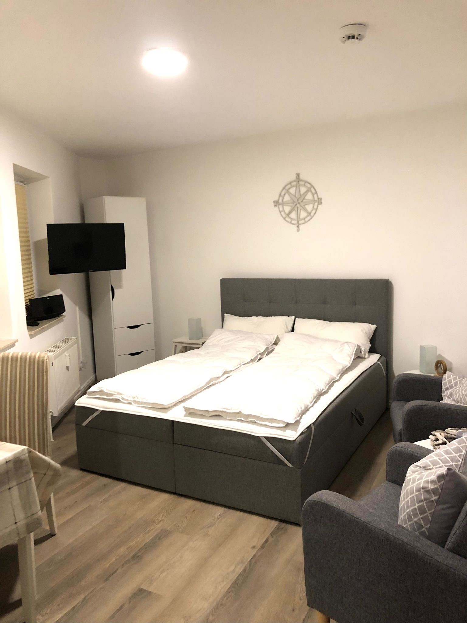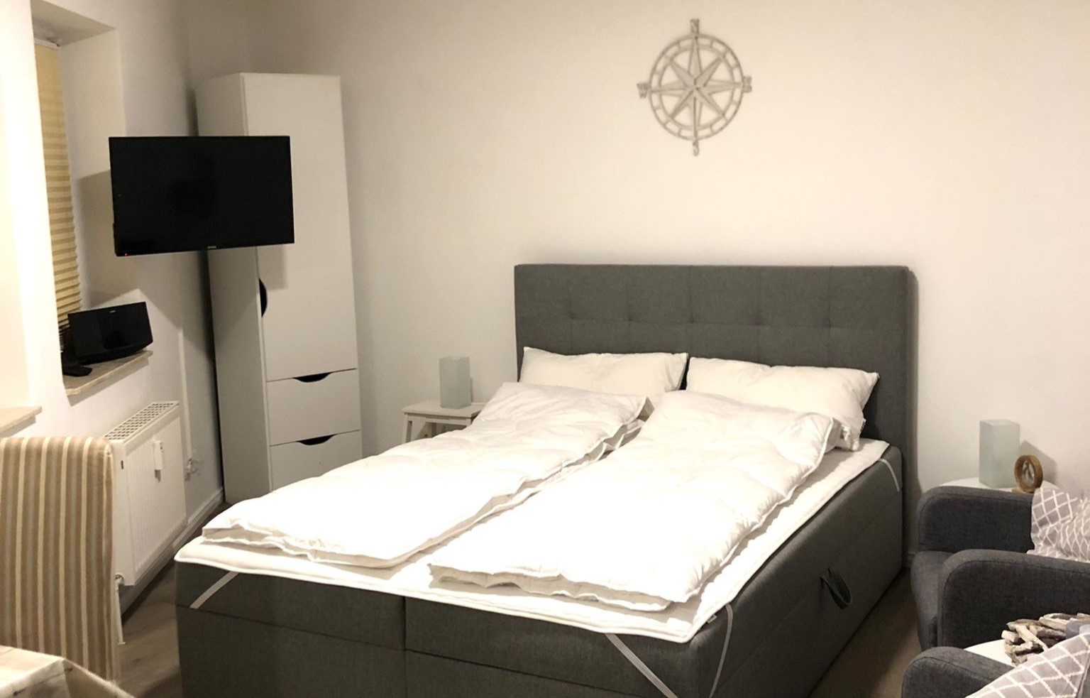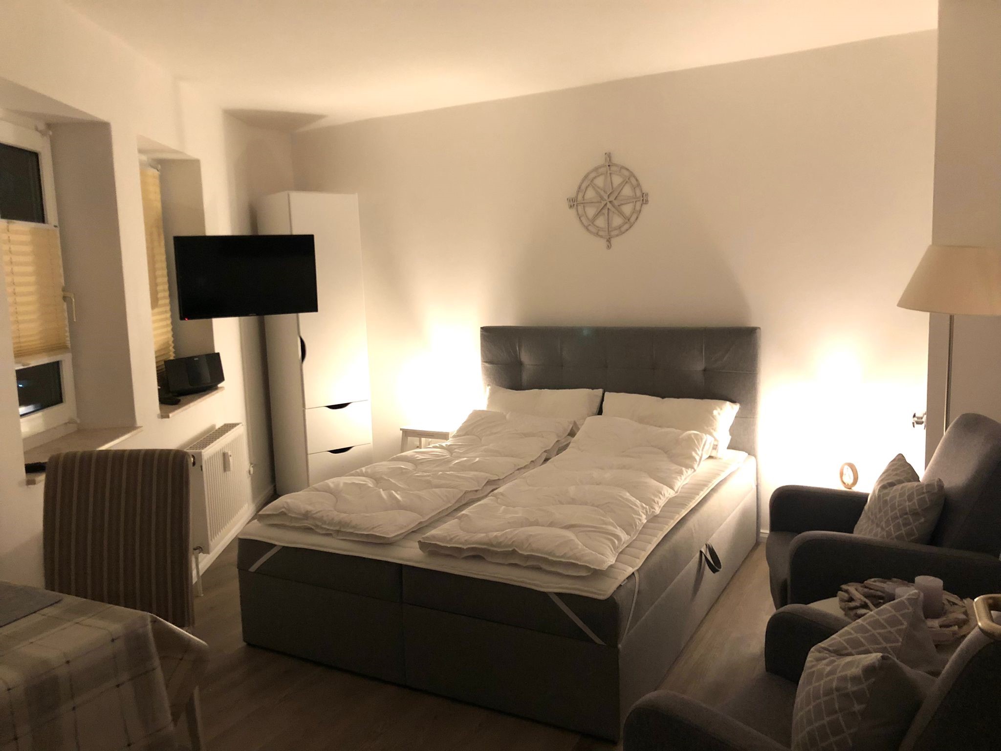 Charmantes 1-Raum-Apartment „Kapitänskajüte“ im Haus Elbe 1 in Duhnen Das gemütliche 1-Raum-Apartment "Elbe 1/21" oder auch „Kapitänskajüte“ befindet sich im Haus Elbe 1, zentral im Herzen von Duhnen. Strandpromenade und Dorfbrunnen sind nur wenige Gehminuten entfernt. Restaurants, Bäcker und Einkaufsmöglichkeiten liegen bequem zu Fuß in der Nähe. Mit ca. 29 m² bietet die Ferienwohnung Platz für bis zu 2 Personen. Der Wohnbereich ist ausgestattet mit einem großen Boxspringbett, einem Fernseher und zwei Sesseln – perfekt für entspannte Stunden. Die Küchenzeile verfügt über Mikrowelle, Kaffeemaschine, Wasserkocher, Toaster und einen Herd mit 2 Kochfeldern, ideal für kleine Mahlzeiten. Ein eigener Tiefgaragenstellplatz gehört zur Wohnung. Fahrräder können sicher untergestellt werden. Waschmaschine und Trockner sind im Haus vorhanden. Bettwäsche und Handtücher können bei Bedarf hinzugebucht werden.