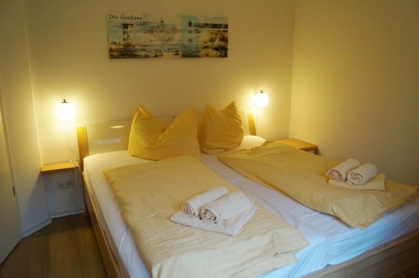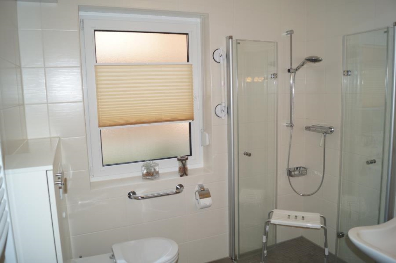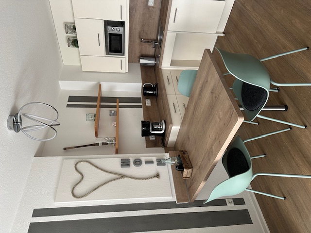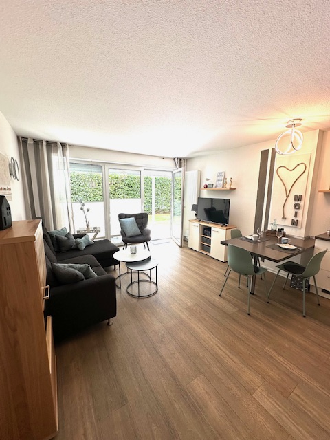 Eine ca. 50 qm große, geschmackvoll eingerichtete rollstuhlgerechte Wohnung. Die Wohnanlage befindet sich ca. 200m vom Dorfbrunnen entfernt in einer ruhigen Seitenstraße. Zum Strand ca 450 m, Ahoi-Bad ca. 450 m, Bäcker ca. 150 m.Die 2 Zimmer Wohnung füt max. 3 Personen, verfügt über ein Doppelbett (Betten mit Komforthöhe) und Federkernmatratzen, Wohnzimmer mit Schlafcouch (geeingnet für eine Person), Tageslichtbad und ebenerdiger Dusche, Haltegriff an der Toilette, Waschtisch körpernah, Spiegelneigung einstellbar, Küche mit Geschirrspüler, Mikrowelle, Herd, Backofen, Kaffeemaschine usw., TV_Flachbildschirm, Radio, Haartrockner, Fenster mit Rollläden, Türbreite ca. 1m, Schlafzimmer gegen elektronische Wellen gedämmt, Waschmaschine und Trockner gegen Gebühr im Haus, Fahrrad-Schuppen, PKW Stellplatz für Rollstuhlfahrer. E-Bikes können kostenlos im Fahrradschuppen geladen werden.Kostenlose Bettwäsche, die Betten sind bei Ankunft bezogen.