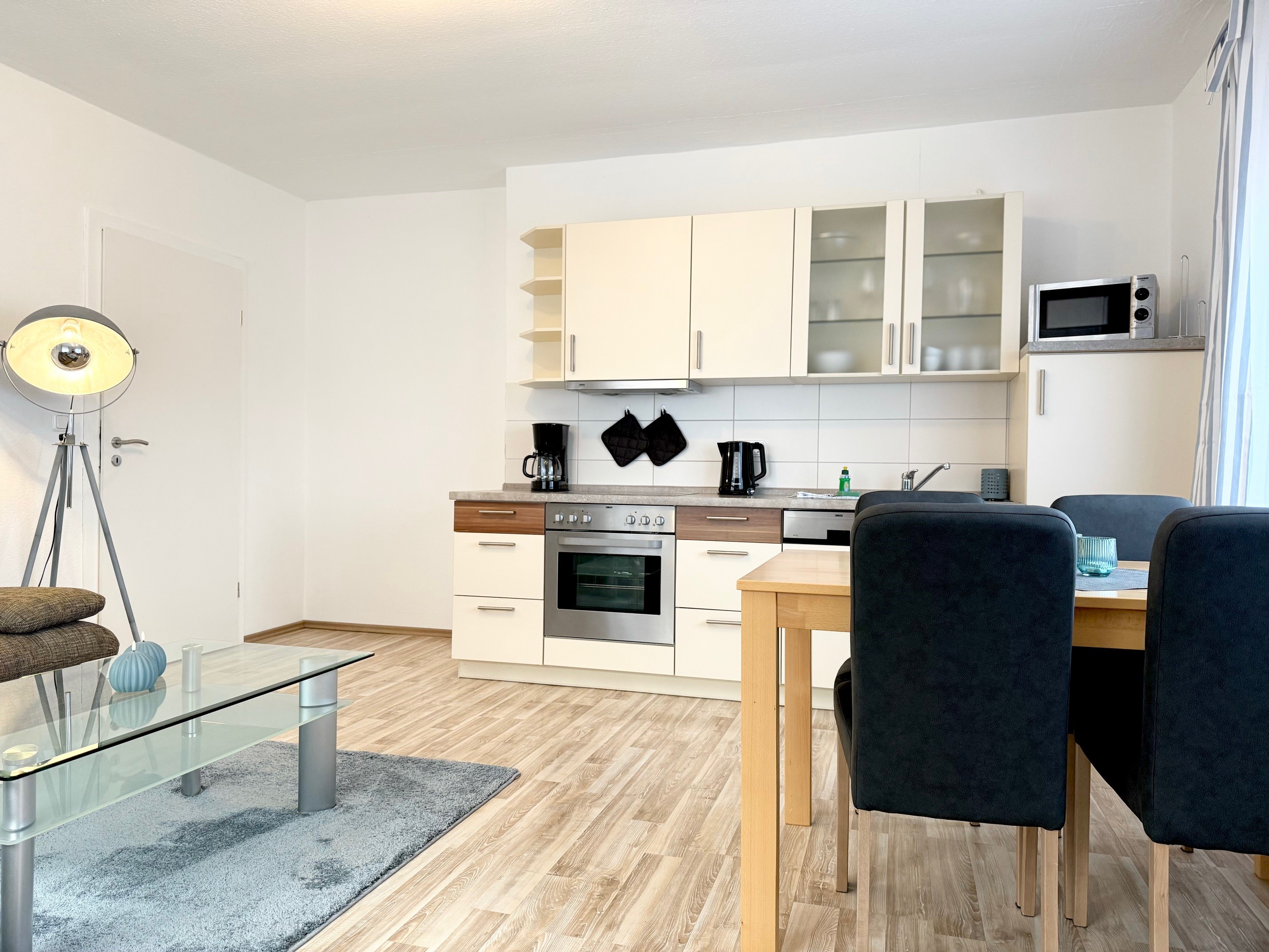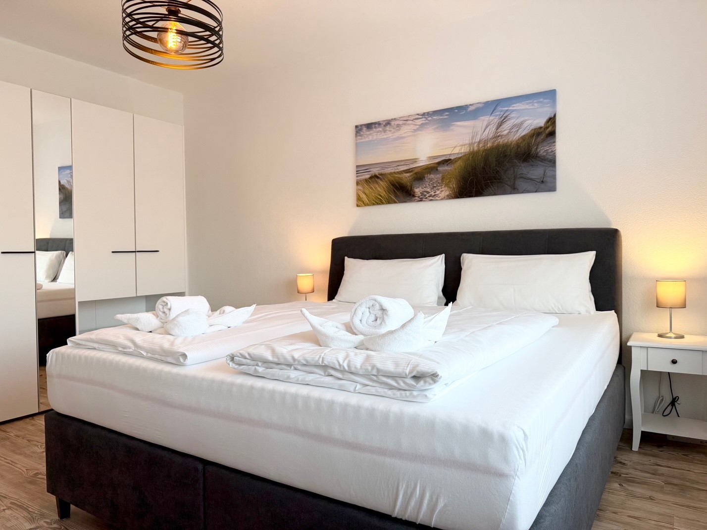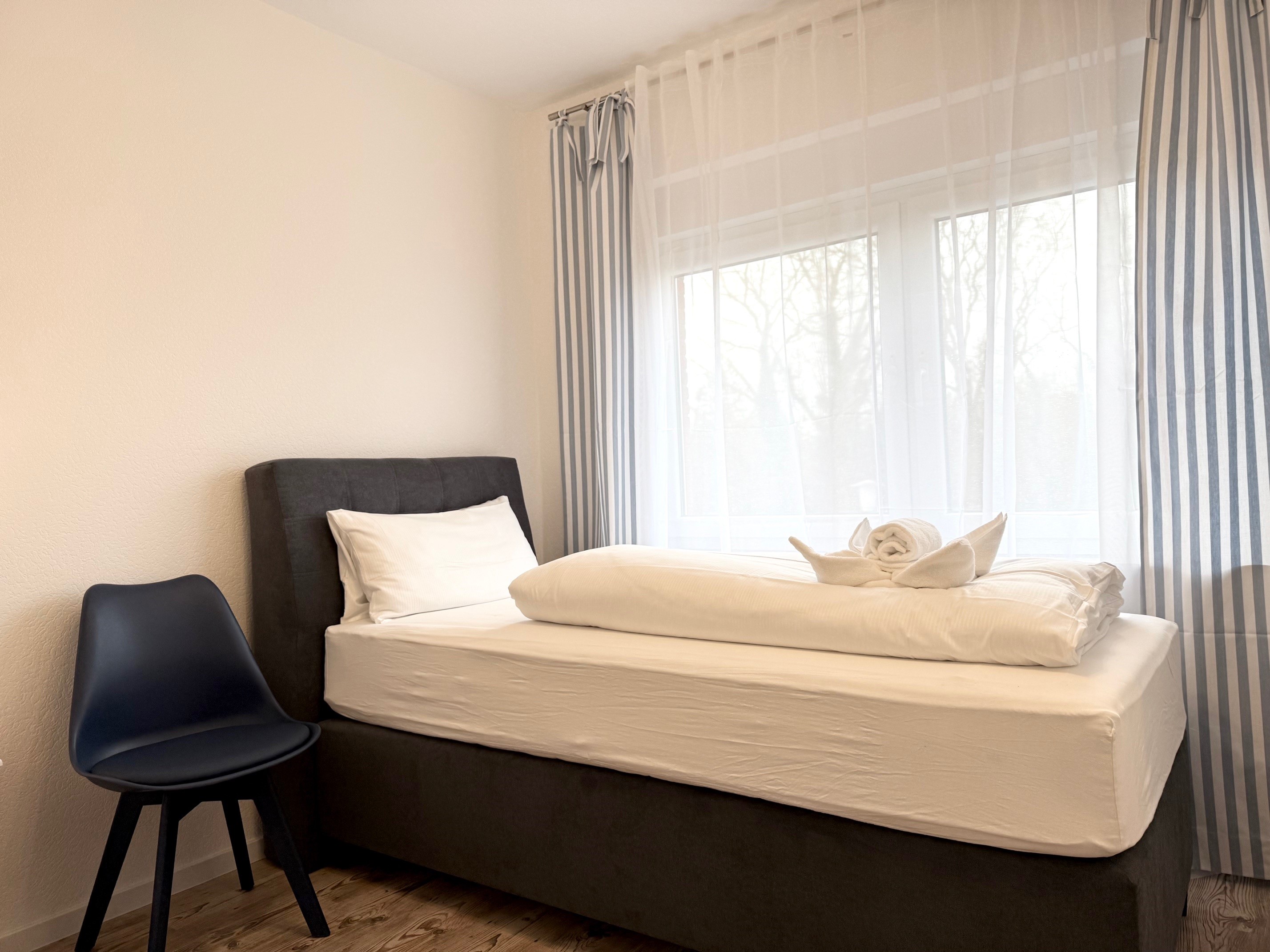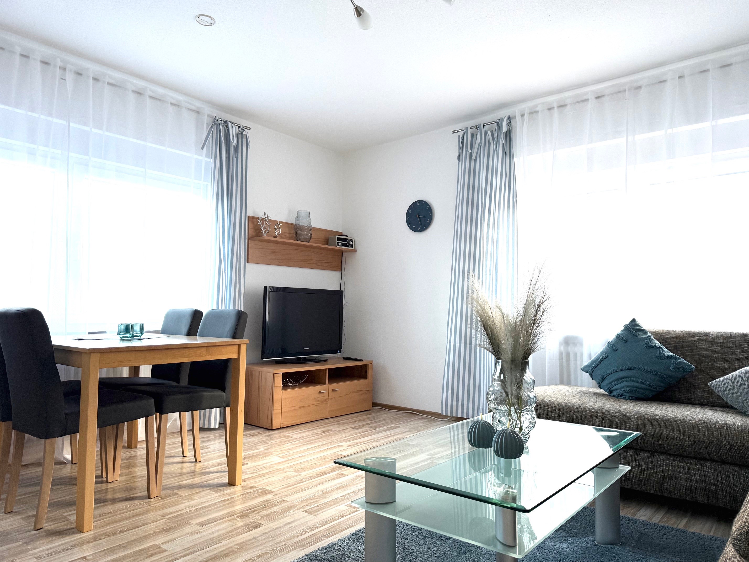 Diese charmant eingerichtete Ferienwohnung befindet sich im 1. Stock und eignet sich ideal für den Urlaub von bis zu vier Personen. Das geräumige Wohnzimmer verfügt über eine bequeme Couchgruppe, einen separaten Essplatz und eine komplett ausgestattete Küchenzeile. Die Küchenzeile ist ausgestattet mit einem Ceranfeld, Backofen, Kühlschrank, Toaster, Wasserkocher sowie einer Mikrowolle. Es sind 2 separate Schlafzimmer vorhanden, eins mit Doppelbett und eins mit zwei Einzelbetten). Die Wohnung ist abdunkelbar durch Außenjalousien. Zu diesem Haus gehört ein 2000qm großer Garten, welcher frei zur Verfügung steht und die Möglichkeit für gemütliche Grillabende oder Sonnenstunden im Freien bietet. Die angegebenen Preise gelten pro Ferienwohnung und Übernachtung. Wäschepaket (Bettwäsche und Handtücher) zu buchbar.